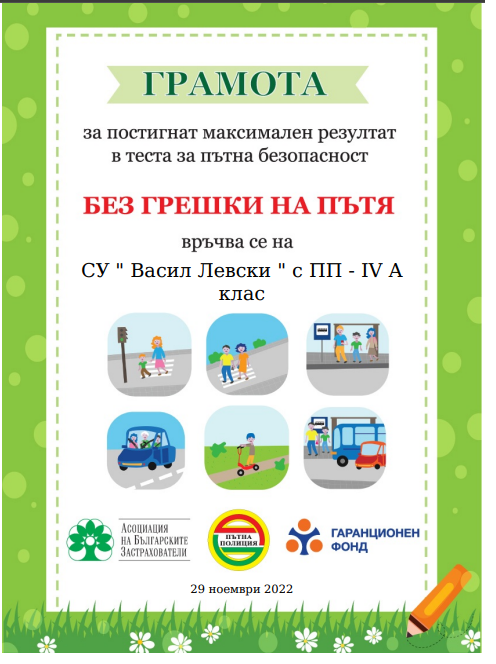 Поздравления за 4а клас за постигнатия максимален резултат теста за пътна