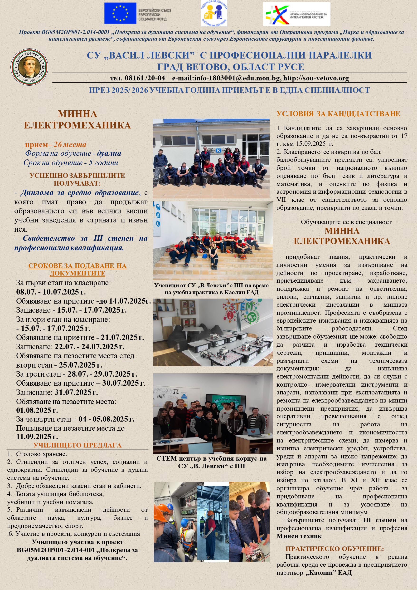 специалност 5440103 „Минна електромеханикапрофесия 544010 „Минен техник“